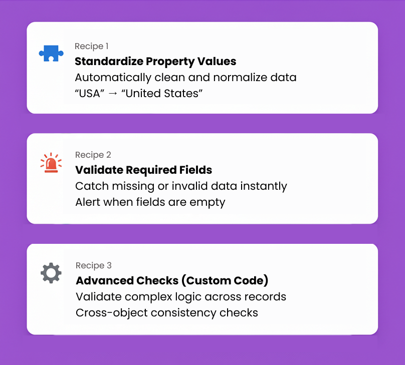 - Custom code actions: For advanced validations, run scripts to check complex conditions across multiple properties or objects.